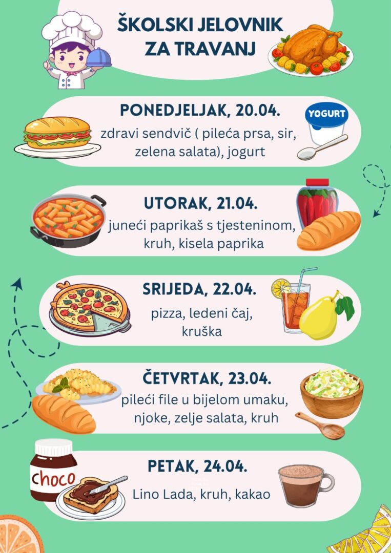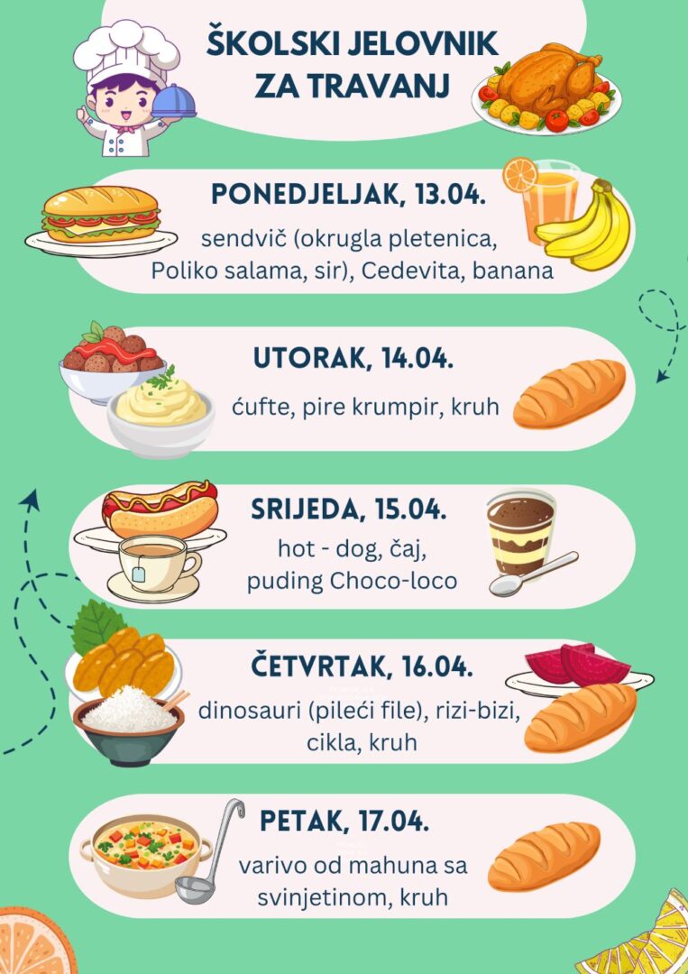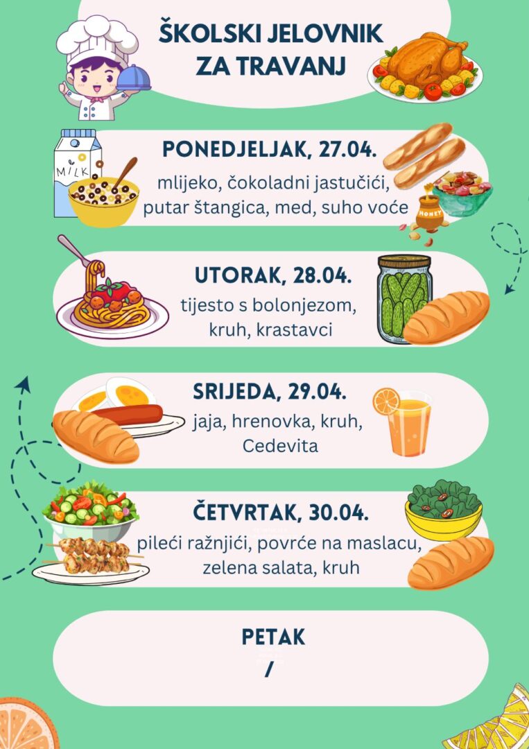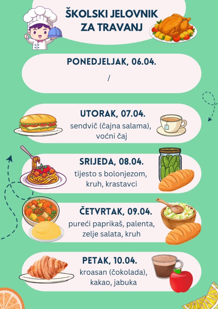 Jelovnik Napomena: Jelovnik je podložan promjenama. Školski jelovnik 2024.-2025. Jelovnik za rujan Jelovnik za listopad Jelovnik za studeni Jelovnik za prosinac Jelovnik za siječanj Jelovnik za veljaču Jelovnik za ožujak Jelovnik za travanj Jelovnik za svibanj Jelovnik za lipanj Školski jelovnik 2025.-2026. Jelovnik za rujan Jelovnik za listopad Jelovnik za studeni Jelovnik za prosinac Jelovnik za siječanj Jelovnik za veljaču Jelovnik za ožujak Jelovnik za travanj EU Učinkoviti ljudski potencijali EU Fondovi EU CARNET EU konkurentnost i kohezija